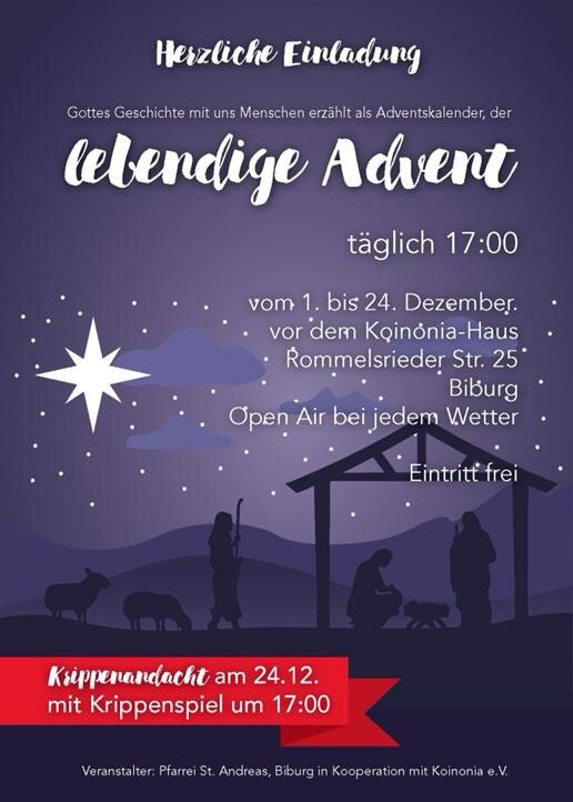 Herzliche Einladung zum „Lebendigen Advent“: Jeden Abend um 17:00 Uhr - vom 1. bis 24. Dezember 2025 - wird das Koinonia-Haus immer heller; wie bei einem großen Adventskalender leuchtet jeweils ein Fenster mehr! Wir hören jeden Tag eine Geschichte aus der Bibel, die uns zum Weihnachtsgeschehen hinführt. Den Abschluss bildet die Krippenandacht mit Krippenspiel am 24. Dezember um 17:00 Uhr. In einer Krippenlandschaft können die Kinder beobachten, wie jeden Tag eine Figur dazukommt. Der „Lebendige Advent“ findet im Freien und bei jedem Wetter statt. Eintritt ist frei. Adresse: Biburg, Rommelsrieder Straße 25.