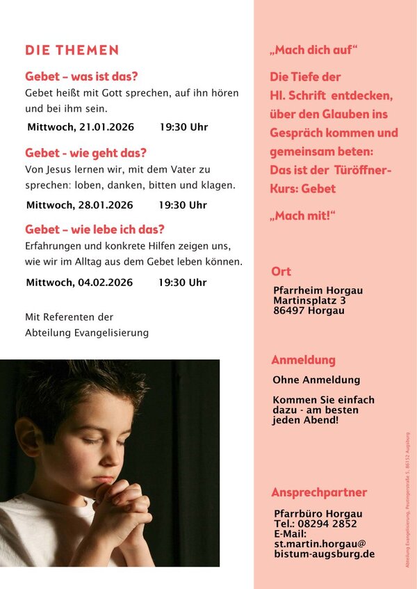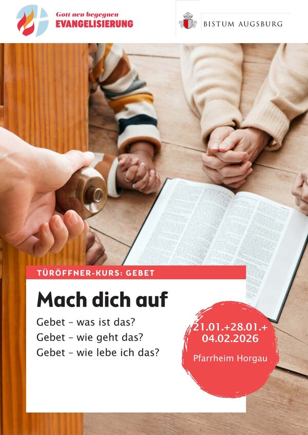 Herzliche Einladung zu einem Glaubenskurs in unseren Pfarreien. Der sogenannte Türöffner-Kurs der Abteilung Evangelisierung im Bistum will das Thema Gebet nahebringen: Gebet - Was ist das? Wie geht das? Wie lebe ich das? Die Abende bestehen jeweils aus drei Teilen: Impuls - Austausch - Gebet; sie finden am 21. Januar, 28. Januar und 04. Februar 2026 statt, beginnen um 19.30 Uhr im Pfarrheim in Horgau, enden um 21.00 Uhr. Eine Anmeldung ist nicht notwendig.